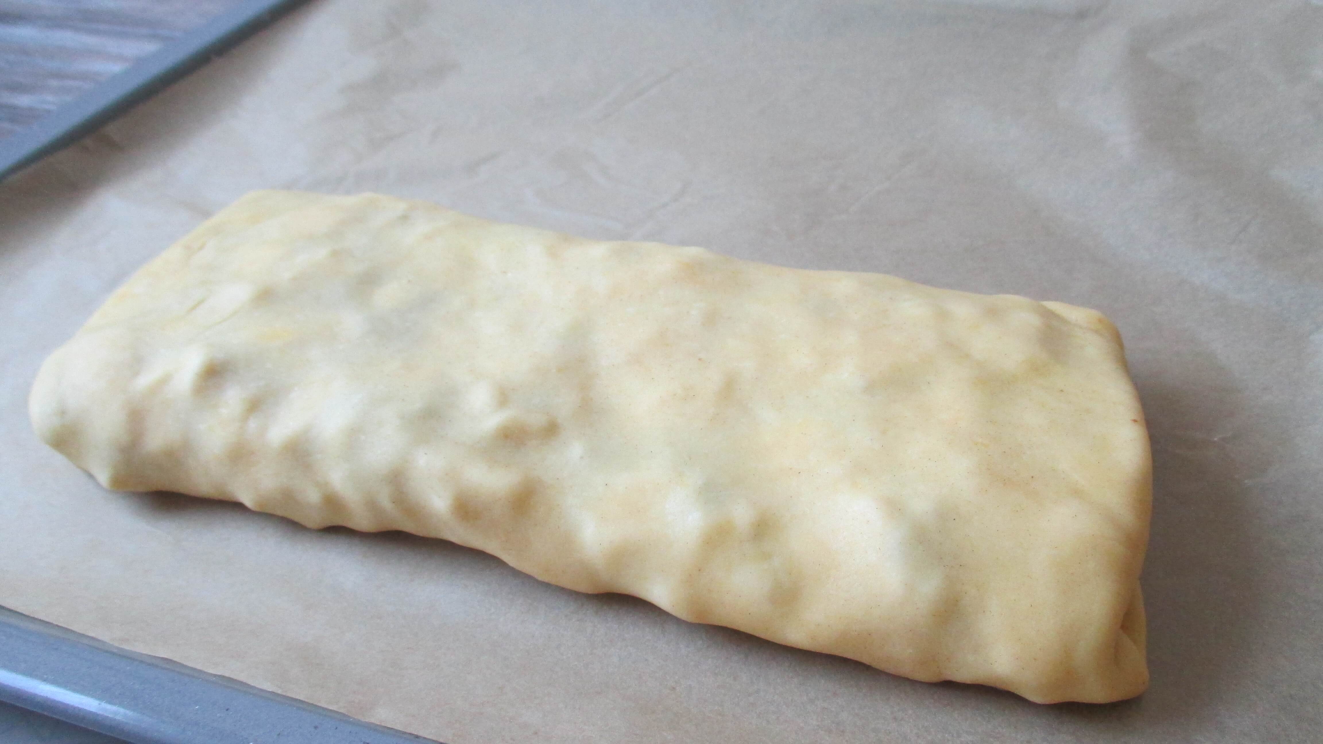 Danach den Teig (wie am Bild ersichtlich einschlagen) und fest andrücken. Mit Hilfe des Backpapiers den Teig mit der Verschlussstelle nach unten auf ein mit Backpapier belegtes Blech legen.
