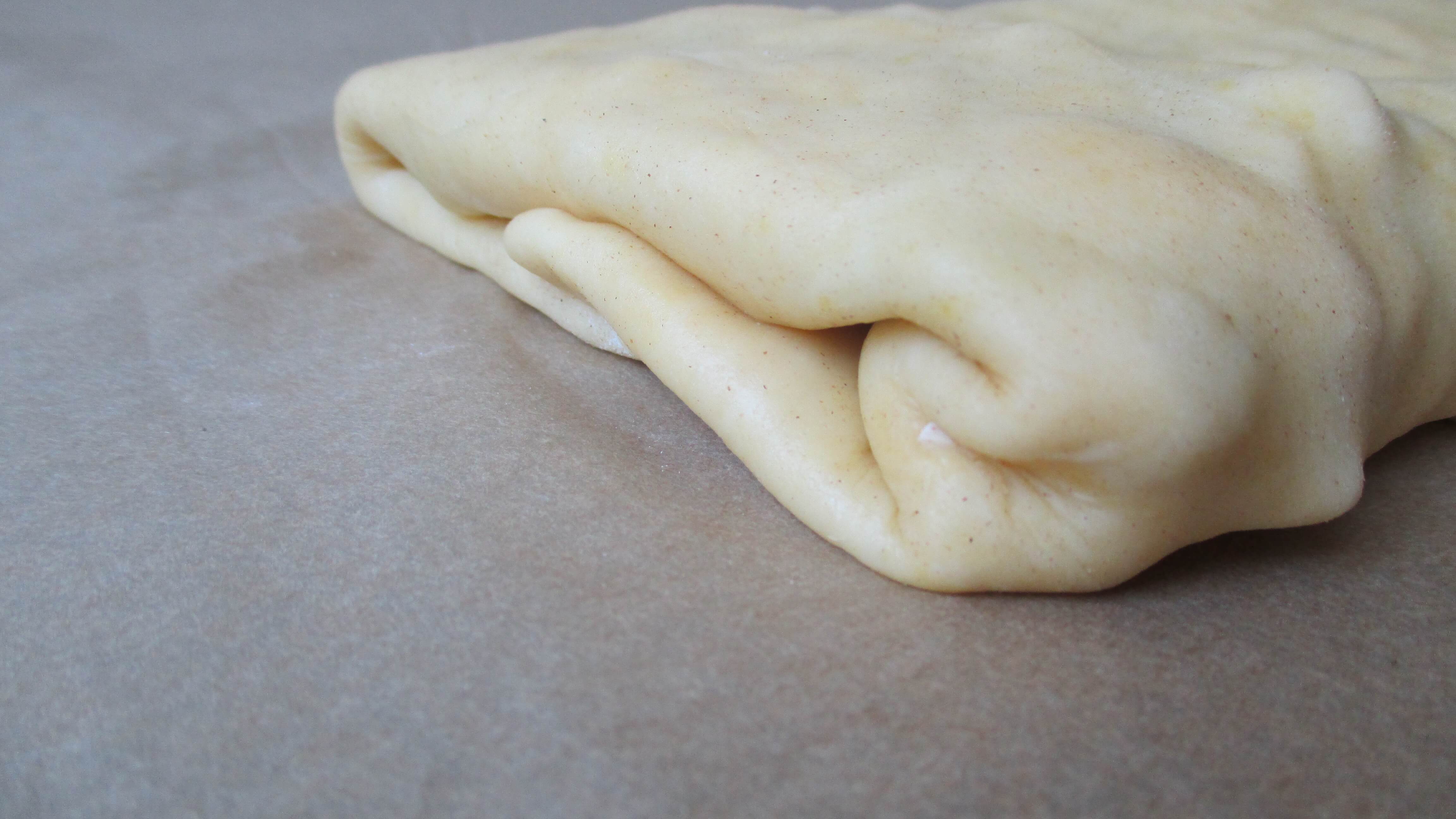 • Den Teig auf ein Backpapier legen (dies ist später sehr hilfreich, wenn man den Strudel mit der Verschlussseite nach unten aufs Blech drehen muss).