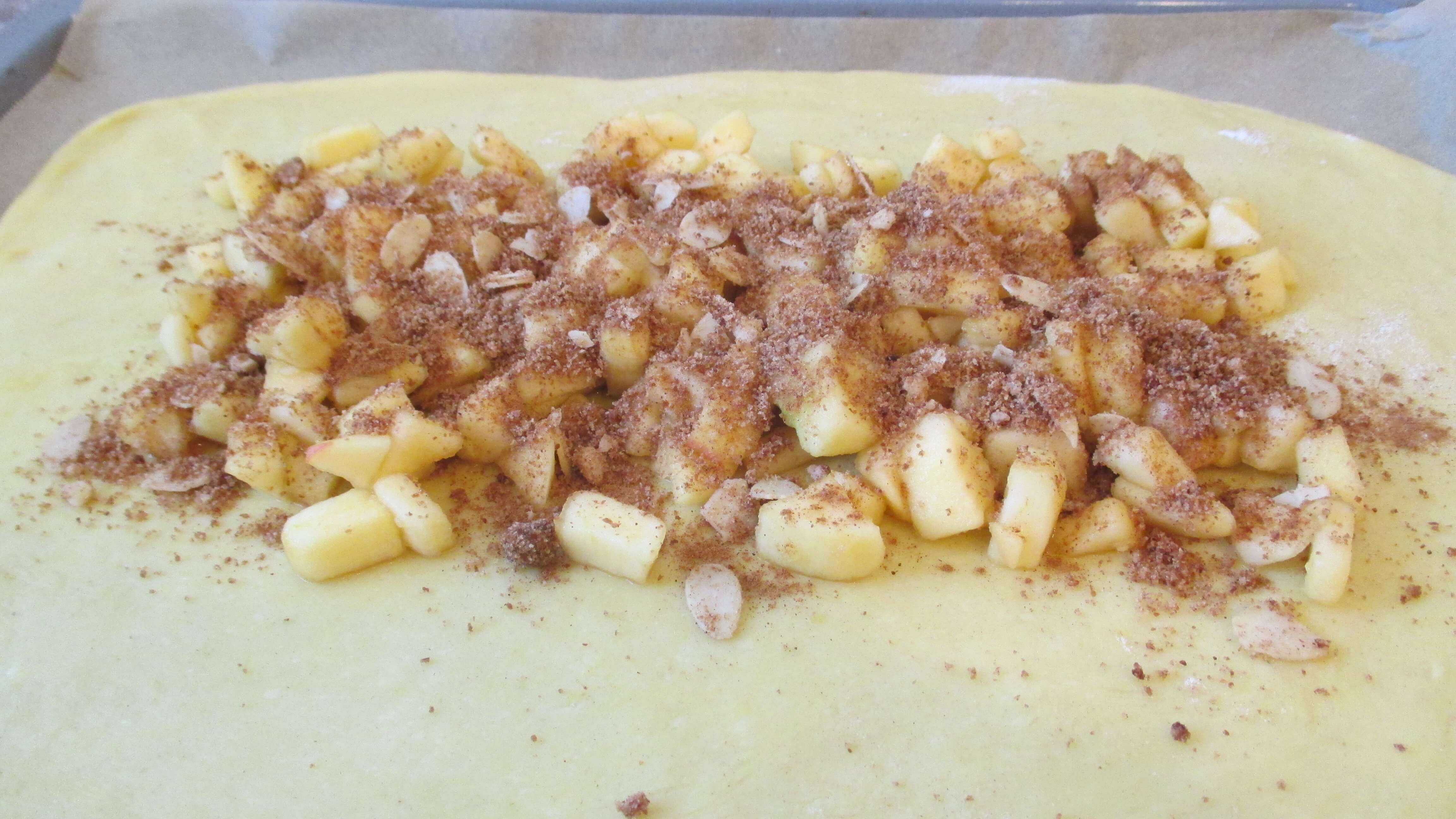 • In der Mitte des Teiges die Hälfte der Apfelfüllung verteilen (so dass am Rand genügend Platz bleibt um den Teig einzuschlagen). Dann mit die Füllung mit Zimt bestreuen und die Hälfte der Brösel-Madel Mischung auf den Äpfeln verteilen.