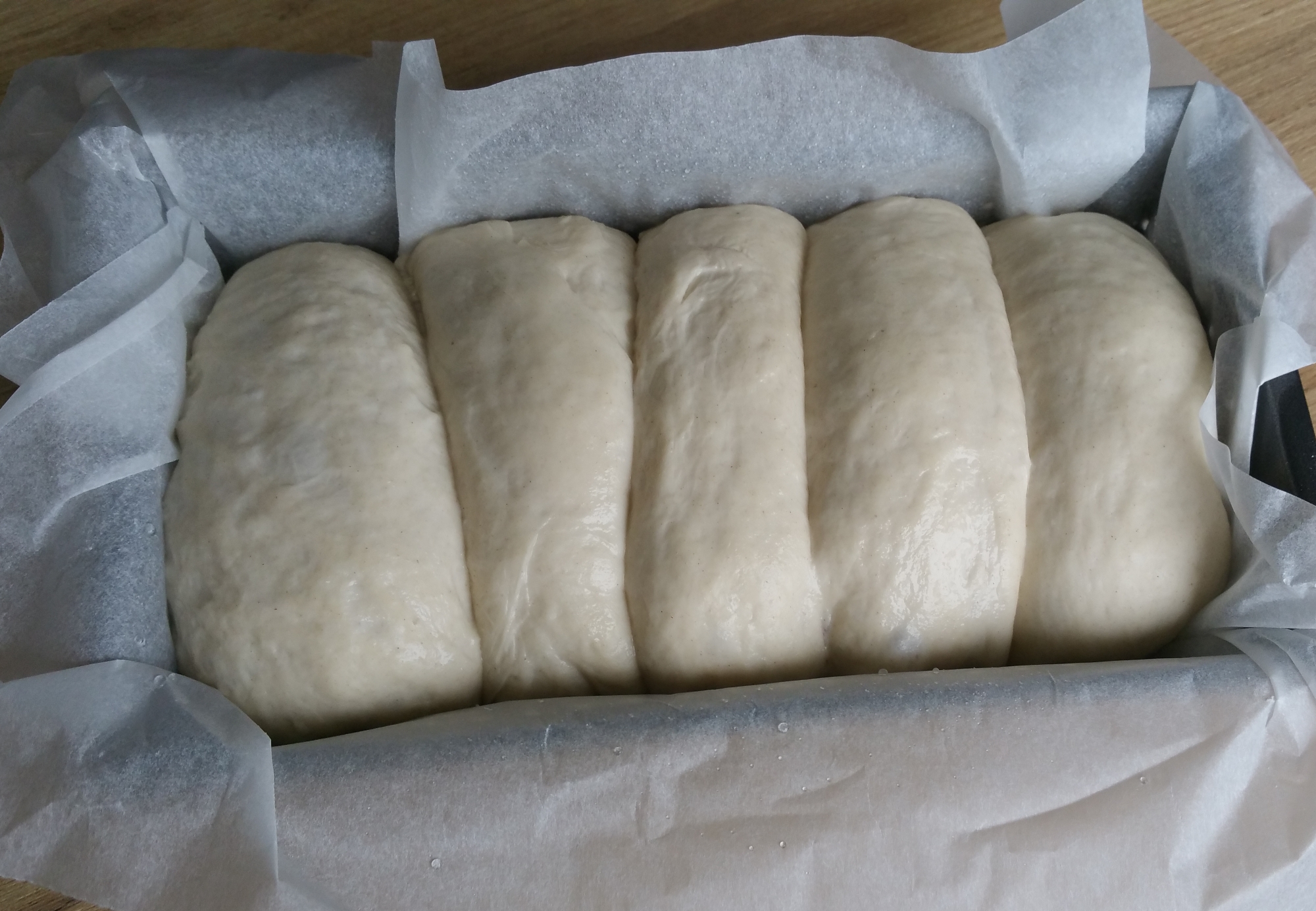 - Den Teig auf eine leicht bemehlte Arbeitsfläche stürzen und kurz durchkneten. In 5 gleich große Stücke teilen und jedes Stück länglich formen und nebeneinander in die mit Backpapier ausgelegte Form legen und nochmals für 30 Minuten ruhen lassen.